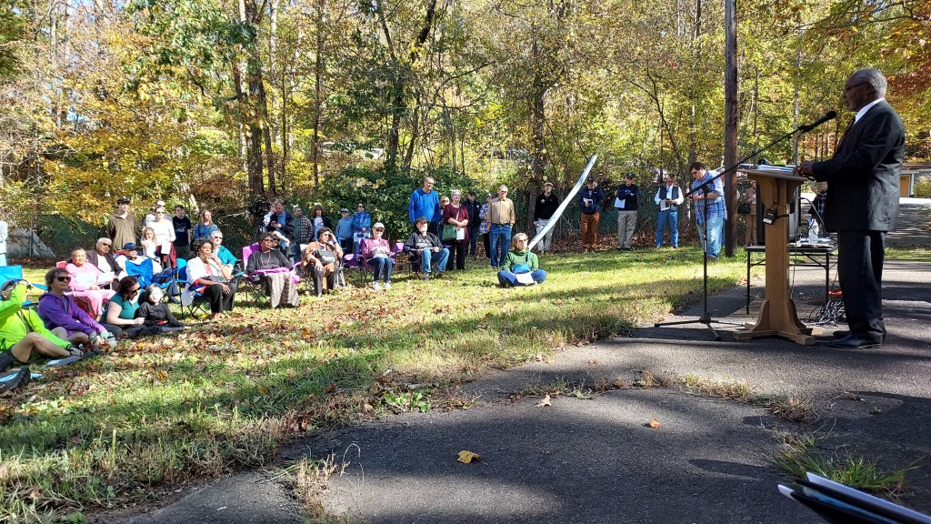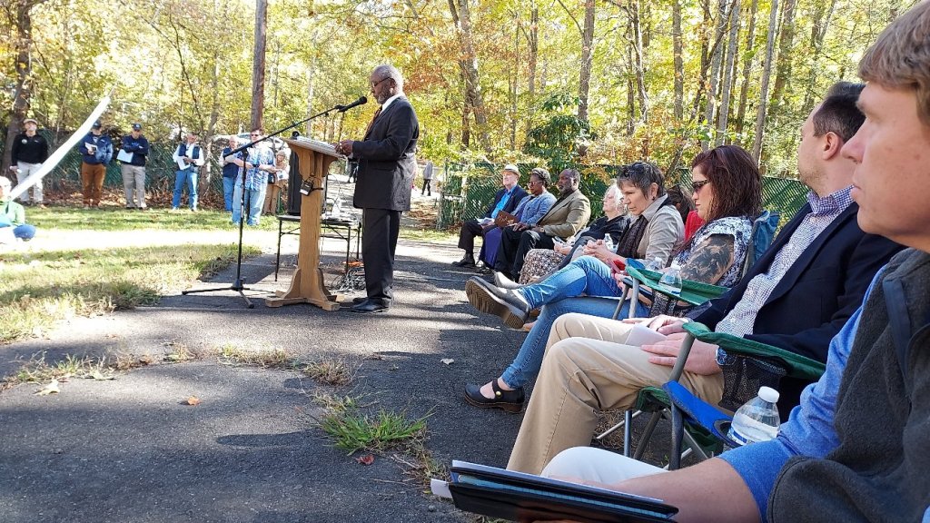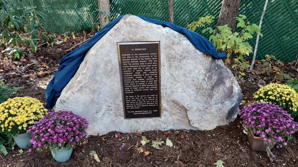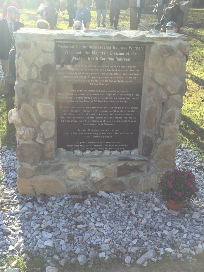 The Memorial Ceremony in Ridgecrest, North Carolina, which took place on Sunday, October 22, 2023 was marked by the unveiling of a stone boulder and plaque commemorating the mostly African American incarcerated laborers who toiled, and whom many lost their lives, in order to build the Western North Carolina Railroad between Old Fort and Ridgecrest, up and over the Swannanoa Gap. This stretch of railroad track remains, to this day, one of the country’s most marvelous and deadly feats of engineering.