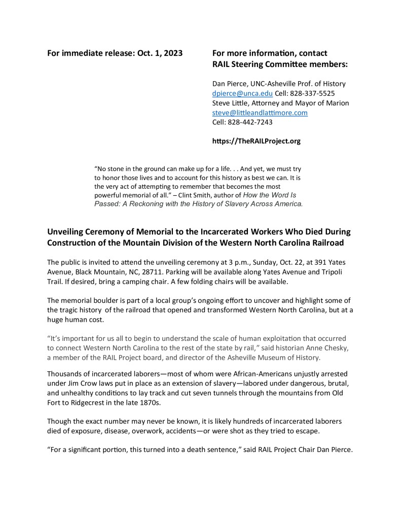 The public is invited to attend the memorial unveiling ceremony on October 22, 2023 at 3 pm at 391 Yates Avenue, Black Mountain, NC 28711. This new memorial boulder is part of RAIL’s ongoing effort to uncover and highlight the history of the railroad which opened and transformed Western North Carolina. Please see the following press release for more information.